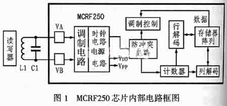MCRF250芯片内部电路框图及与读写器构成的应用系统如图1所示。芯片的引脚VA和VB外接电感L1和电容C1构成的谐振电路(谐振频率为125KHZ, L1参考值为4.05MH,C1参考值为390PF)。读写器(READER)侧的电路谐振于125KHZ以用于输出射频能量,同时也用于接收MCRF250芯片以负载调制方式传来的数字信号。MCRF250芯片内部电路由射频前端、防冲突电路及存储器三部分组成。