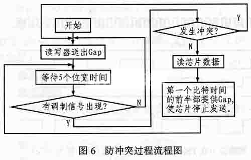 读写器组成由晶体振荡器(4MHZ)、分频器、功率放大器、GAP产生电路、包络检波、放大滤波整形电路、FSK解调电路、冲突检测电路和微控制器组成。下面主要介绍防冲突流程及冲突检测电路。  MCRF250的防冲突流程图如图6所示。读写器开始送出GAP,其时间间隔(载波缺损时间)为60μs(误差不大于20%)。然后等待5个位宽时间,检测有无调制信号出现,若有调制信号出现,再判断是否发生冲突。如果无冲突出现,则读完该MCRF250芯片数据后,再按规定形成一个新的GAP,以进行下一次读取。
